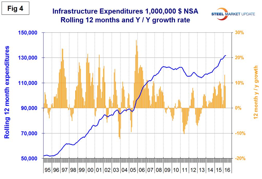 Expenditures have had positive growth every month since July 2013 but growth slowed each month from August through December last year. In January there was a recovery to 3.3 percent which continued into April when y/y growth was 8.7 percent with positive momentum. Highway and streets including pavement and bridges account for about 2/3 of total infrastructure expenditures and had positive growth every month since April 2015 culminating in an 11.5 percent rate in three months through April. Highway pavement is the main subcomponent of highways and streets and had an 11.5 percent positive growth in three months through April. Bridge work has had positive growth for each of the last 17 months and exceeded $2.2 billion in the single month of April with a 1.2 percent growth rate (Table 4).