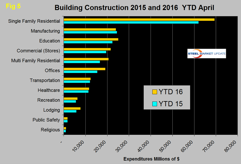 Figure 5 compares YTD expenditures for building construction for 2015 and 2016.