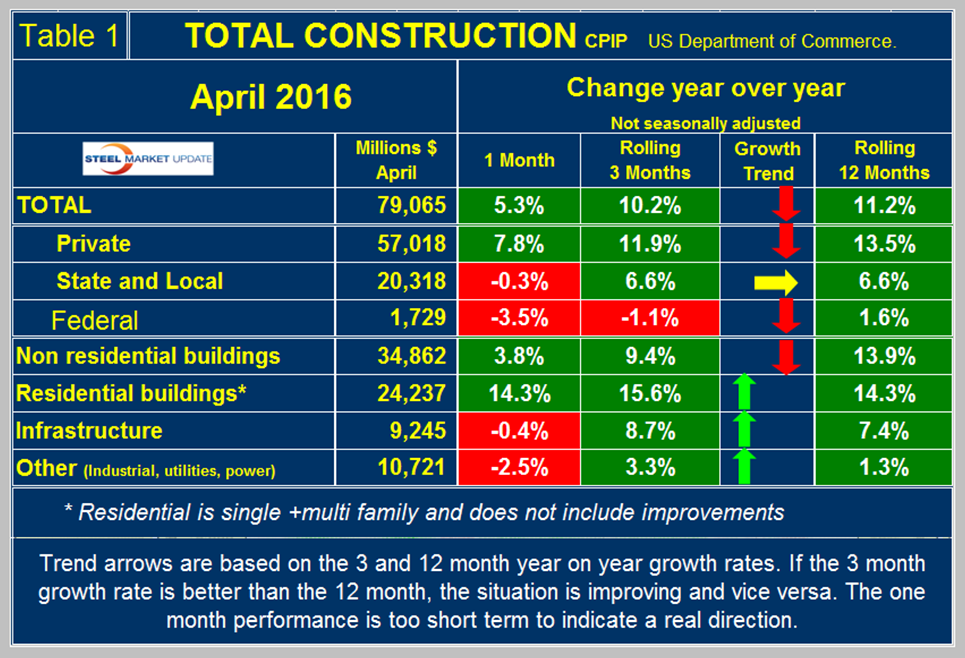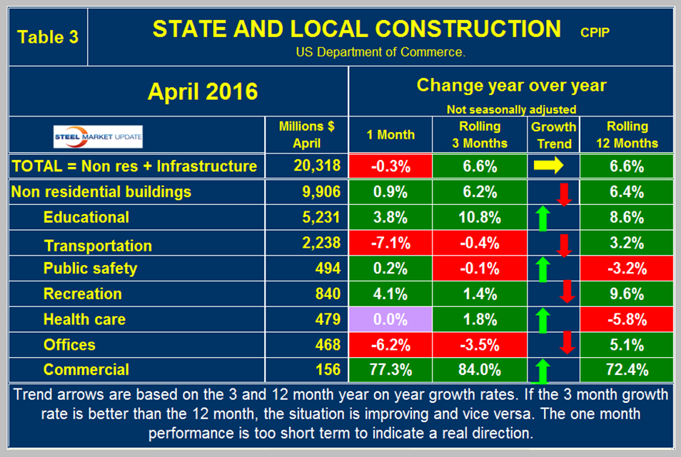 Explanation: The official CPIP press report gives no appreciation of trends on a historical basis and merely compares the current month with the previous one on a seasonally adjusted basis. The data is provided as both seasonally adjusted and non-adjusted. The detail is hidden in the published tables which we at SMU track and dissect to provide a long term perspective. Our intent is to provide a rout map for those subscribers who are dependent on this industry to “Follow the money.” This is a very broad and complex subject therefore to make this monthly write up more comprehensible we are keeping the information format as consistent as possible. In our opinion the absolute value of the dollar expenditures presented are of little interest. What we are after is the magnitude of growth or contraction of the various sectors. Data is reported by the Commerce Department on both a seasonally adjusted and non-adjusted basis. Their official commentary is based on adjusted numbers. In the SMU analysis we consider only the non-seasonally adjusted data because we don’t trust seasonal adjustments and in any case our businesses operate in a seasonal world. We eliminate seasonal effects by comparing rolling three month expenditures year over year. CPIP data also includes the category of residential improvements which we have removed from our analysis in the rational that such expenditures are minor consumers of steel.