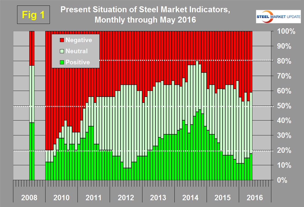 Changes since the last update were as follows: Bank lending standards for commercial and industrial loans were revised from neutral to negative as banks tightened their lending standards. Service center apparent excess declined sharply as shown in the graph below and was revised from neutral to positive. Shipments of long products were revised from negative to neutral as volume in 3 months through April exceeded 4.5 million tons for the first time since the recession. Service center shipments of flat rolled products were revised from negative to neutral as volume exceeded 110,000 tons. There was no change in our perception of any of the construction and manufacturing indicators. Figure 1 shows the change in our assessment of the present situation since January 2010 on a percentage basis. The number of indicators classified as positive peaked at 47.2 percent in October 2014 and steadily declined to 11.1 percent in the three months through last December. By May 31st the positives had risen to 17.6 percent. Through the course of 2015 there was not much change in the number of indicators that we considered to be historically negative, what happened was that the decline in the positive indicators occurred as a shift to neutral.