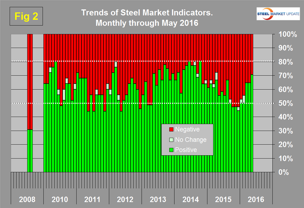 The proportion of indicators trending positive through May 31st was 70.6 percent with 29.4 percent trending negative. There has been a tremendous surge in positives since December when only 44.4 percent of indicators were trending positive. Most values in the trends columns are three month moving averages (3MMA) to smooth out what can be very erratic monthly data. Figure 2 shows the trend of the trends. In October 2014 the proportion trending positive was 80.6 percent which coincided with the highest month of total steel supply since the recession. There was a steady deterioration through 2015. At the end of 2015 the proportion trending positive fell below 50 percent for the first time since March and April 2013. Figure 2 shows the pre-recession situation at the far left of the chart. In August 2008 over 2/3 (69.2 percent) of our indicators were trending negative and the steel market crashed in September of that year.