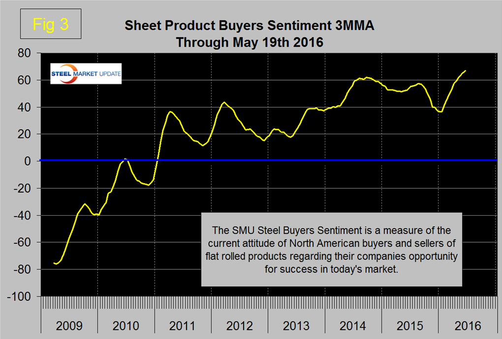 In the general economy, the direction of the Conference Board consumer confidence index and of the Chicago Fed National Activity Index both reversed course and became slightly negative on a 3MMA basis. Even as banks tightened lending standards, demand for commercial and industrial loans strengthened and began to trend positive. Both of the Steel Market Update proprietary indices have been trending positive since our December 31st update. The SMU buyer’s sentiment index at 65.5 on May 19th was at an all-time high since its inception in 2009 as shown in Figure 3.