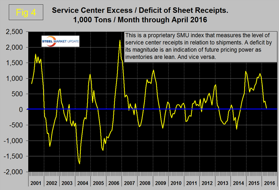 The calculation of service center excess inventory of sheet products has declined from over a million tons in the last four months of 2015 to a mere 46,000 tons in April. A high excess is indicative of low pricing power therefore we regard this trend as extremely positive (Figure 4).