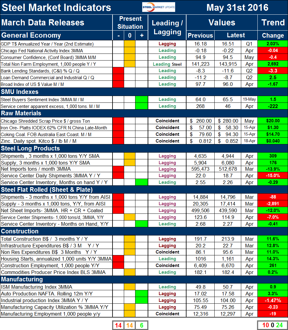 There was a decrease of one negatives since we last published this review on March 31st and an increase of one positive. We currently regard 6 of the 34 indicators to be positive, 14 to be neutral and 14 to be negative on a historical basis. The present situation of the general economy with the exception of loan demand and the value of the US $ is OK. Not great and not unsatisfactory by historical standards. Last week’s update of the growth of GDP in Q1 was revised up from the first estimate. All the raw materials prices currently have a negative present situation. Shipments and supply of long products through April based on SMA data were looking better than for flat rolled through Mach based on AISI data. (AISI reports lag the SMA).