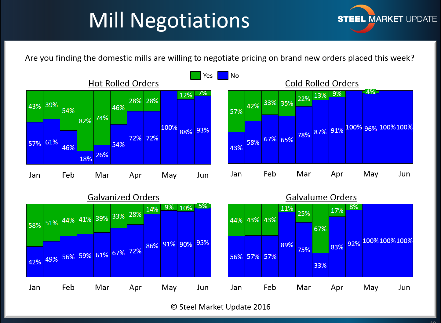 Blue is the color of the sky and that may be the limit when it comes to domestic steel mills need to negotiate flat rolled steel pricing. Based on the results from this week’s flat rolled market trends analysis produced by Steel Market Update, steel buyers and sellers are reporting, almost unanimously, that all of the steel price negotiating cards are in the hands of the domestic steel mills.