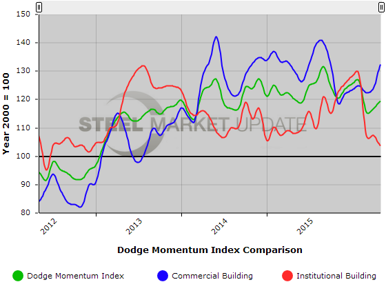 Below is a graph showing the history of the Dodge Momentum Index. You will need to view the graph on our website to use it’s interactive features, you can do so by clicking here. If you need assistance with either logging in or navigating the website, please contact our office at 800-432-3475 or info@SteelMarketUpdate.com.
