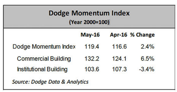 “May’s increase places the overall Index 3.6% higher than its year-ago level, suggesting further growth in construction activity in 2016 despite the subdued first quarter GDP report and signs that lending standards are beginning to tighten for commercial projects,” said Dodge Data & Analytics. “This recent improvement for commercial projects provides some evidence that construction plans are moving forward after the severe drop-off in planning that occurred with the financial market instability in late 2015. At the same time, institutional planning is 1.3% lower than it was in May 2015, settling back for now from the heightened activity reported in late 2015 and early 2016.”