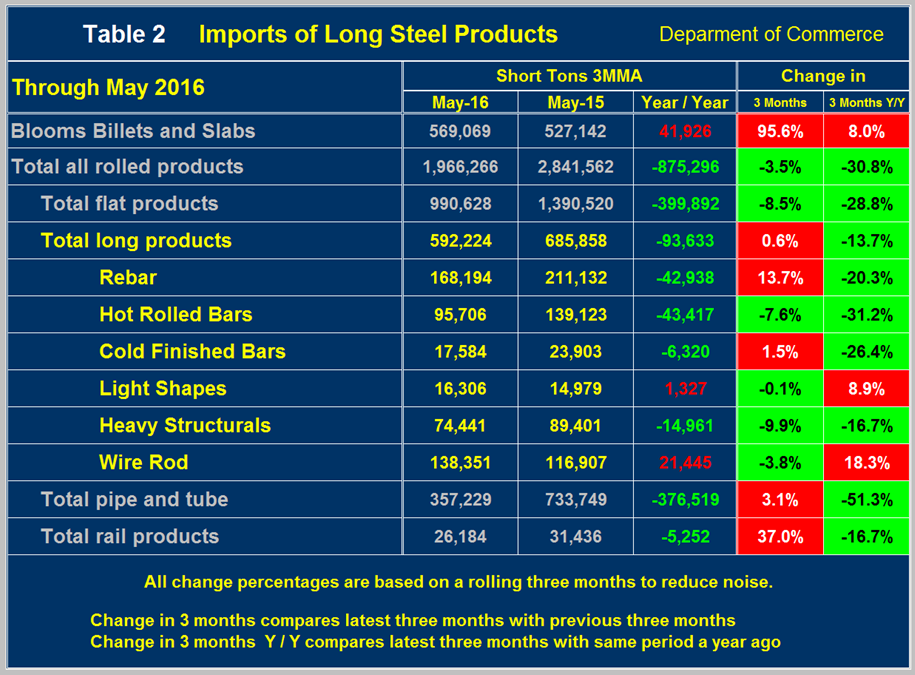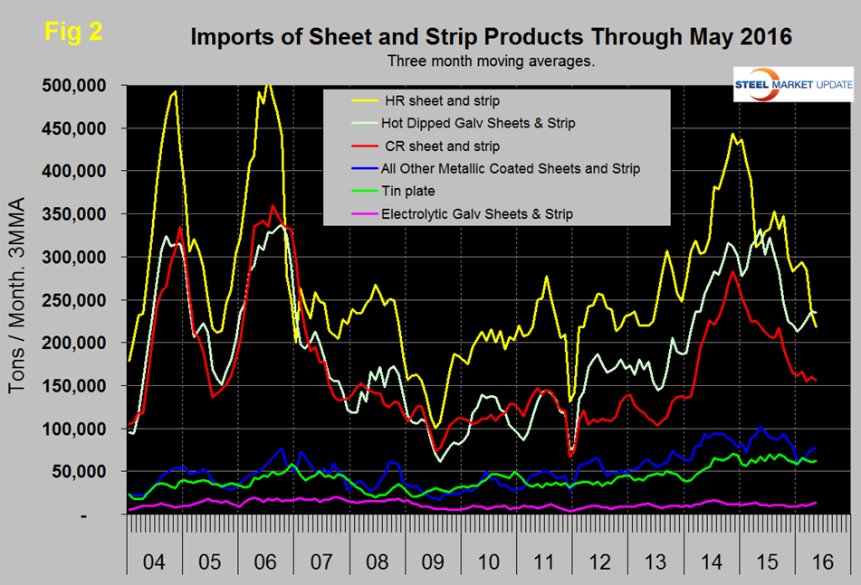 Imports of semi-finished in May were 787,055 tons with a three month moving average of 569,069 tons. The May semi-finished volume was down by 9.7 percent from the average of the first six months of 2015. February this year had a very low volume of semis as shown by the red line in Figure 1. “Flat” includes all hot and cold rolled sheet and strip plus all coated sheet products plus both discrete and coiled plate. The 3MMA of flat rolled imports peaked at 1,634,000 tons in November 2014 and has steadily fallen to 990,628 tons in May which was the first month below a million tons since January 2014. Long product imports have been range bound between 519,000 tons and 772,000 tons since March 2014 with no particular trend evident. In May the 3MMA of long product imports was 592,224 tons.