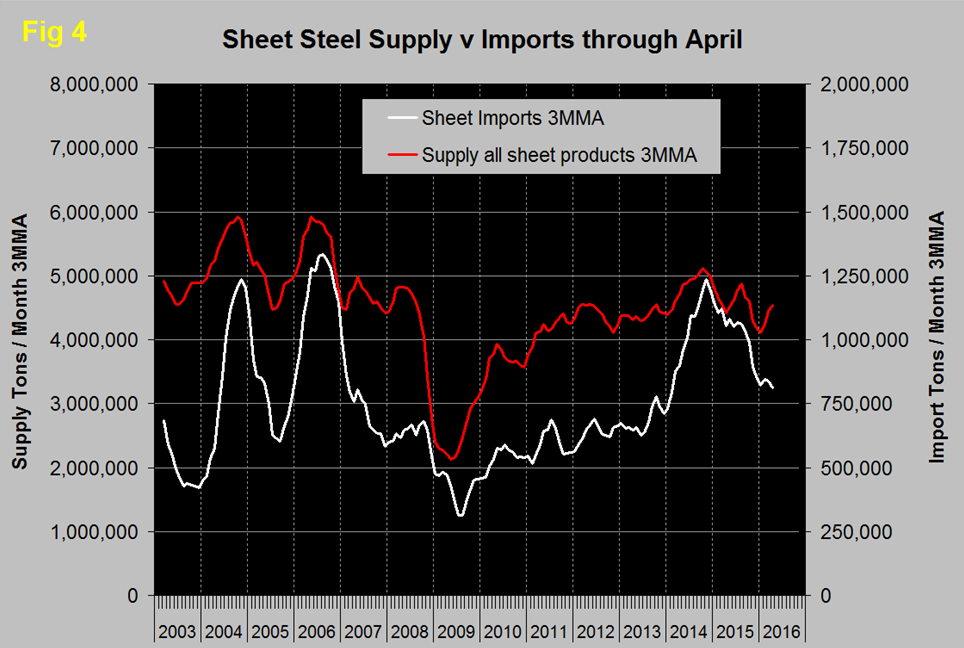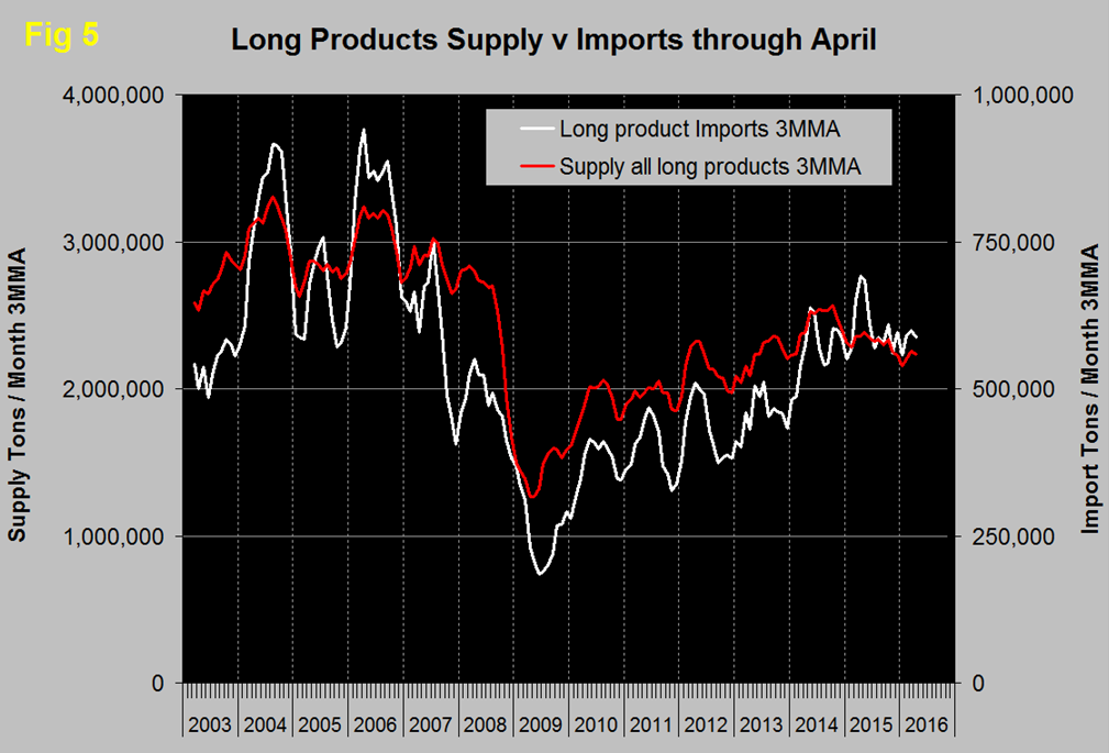 Figure 3 shows the import market share of sheet and long products through April which is the latest data available for total steel supply.