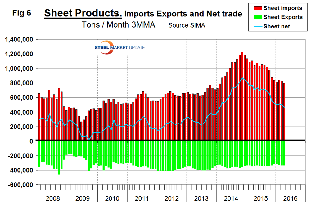 Net imports equals imports minus exports and our analysis is based on the final volumes through April. We regard this as an important look at the overall trade picture and its effect on demand at the mill level. Figure 6 shows that net sheet product imports on a 3MMA basis at 445,092 tons in April were down by 237,000 tons year over year and down by over a million tons YTD.