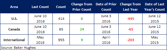 According to Baker Hughes data from June 10, 2016, the U.S rig count for the week was 414 rigs exploring for or developing oil or natural gas. This is up 6 rigs compared to last week. Compared to this time last year, the 414 count is down 445 rigs. The is the second week in a row that the U.S. rig counts have increased, bringing hope to the steel industry that we are now bouncing off the bottom of the market and that rig counts will continue to rise from here.