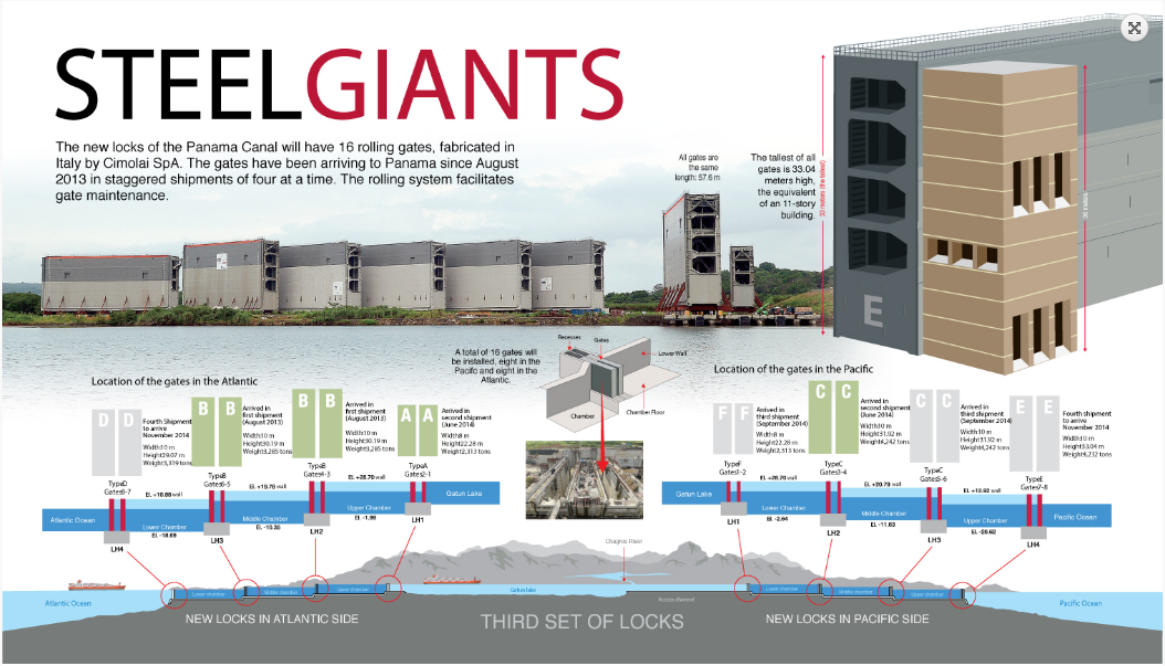 The new locks are 1,400 feet long, 180 feet wide and 60 feet deep and will accommodate the Neo-and Post-Panamax vessels that are 1200 feet long and 160 feet wide.