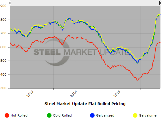 SMU Note: Below is a graphic showing our hot rolled, cold rolled, galvanized, and Galvalume price history. To use the graphs interactive capabilities, you must view it on our website here. If you need help navigating the website or need to know your login information, contact us at info@SteelMarketUpdate.com or by calling 800-432-3475.