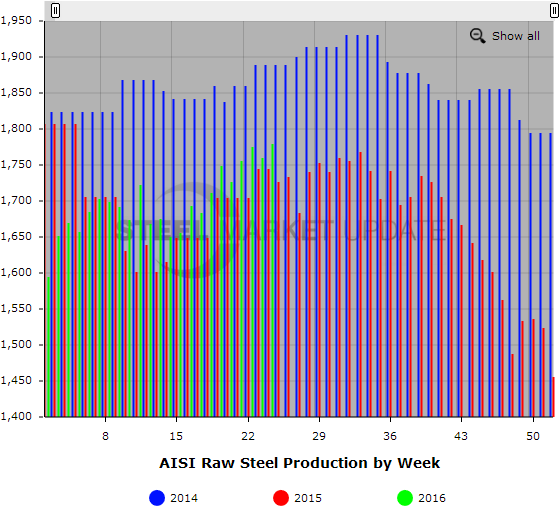 Note that the AISI estimates capability for Q2 2016 to be 30.4 million tons versus 30.7 million tons for the same period last year and 30.4 million tons for the Q1 2016.