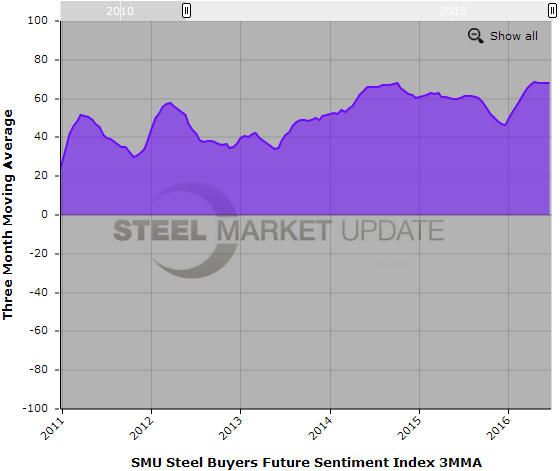 Steel Market Update prefers to look at our data from a three month moving average perspective. This takes any “bumps” out of the numbers and provides a clearer picture as to the trend. On a three month moving average (3MMA) basis Sentiment is +69.00 a new record high. Two weeks ago our 3MMA was +68.67 and one year ago it was +55.17.