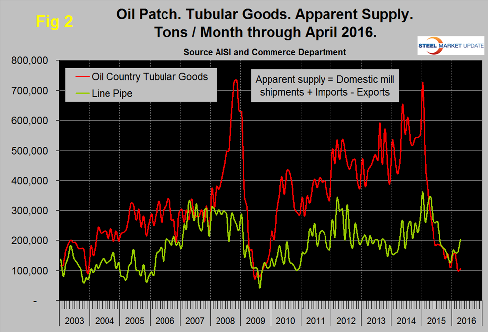 Figure 2 shows the apparent supply of the two main steel tubular products used in oil and gas production from January 2003 through April 2016 (Apparent supply is a proxy for demand.) Following a weak December, line pipe demand has coincided with the rising oil price but OCTD took another dive in March to its lowest post-recession level with a small uptick in April.
