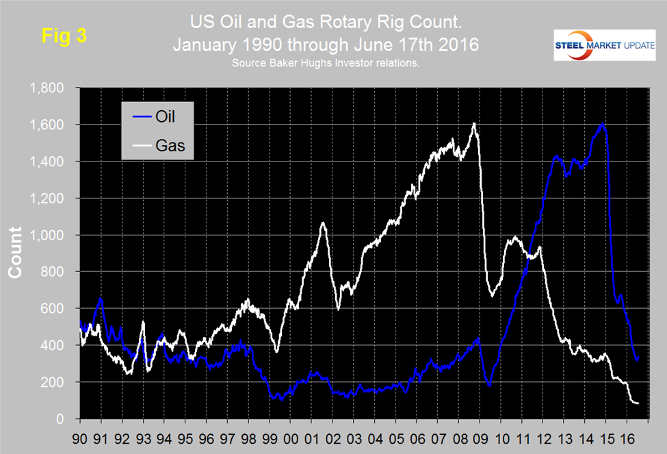 The total number of operating rigs in the US and Canada on June 17th was 491, down from 871 at the start of 2016 and down from 2,018 on January 2nd 2015. However the rig count has risen for three straight weeks from 445 on May 27th. The oil rig count was up in both the US and Canada in the last three weeks and the gas rig count was up in Canada but not in the US. Figure 3 shows the Baker Hughes US Rotary Rig Counts for oil and gas equipment in the US through June 17th. (Explanation below). The small uptick in the US oil rig count was the first since July of last year presumably driven by the oil price breaking through $50. Based on the most recent available data, the EIA estimates that oil production from hydraulically fractured wells now makes up about half of total U.S. crude oil production. U.S. crude oil production averaged an estimated 9.4 million barrels per day (b/d) in 2015, and it is forecast to average 8.7 million b/d in 2016 and 8.2 million b/d in 2017. The decline in the gas rig count has leveled off with very little change in the last seven weeks. However the number of operating rigs in that time frame is lower than at any time since our data began in January 1988.