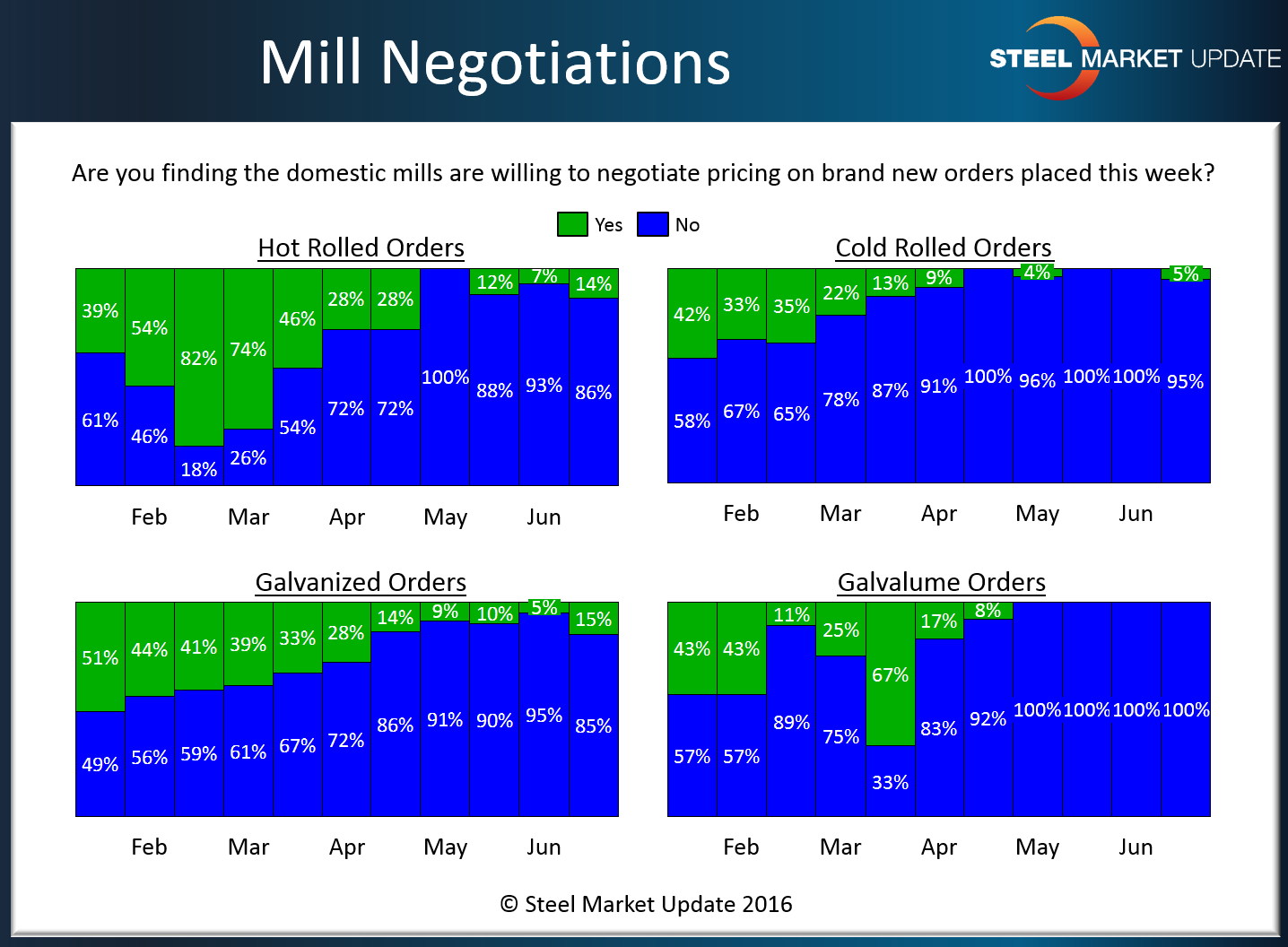 Last week we invited hundreds of companies associated with the steel industry to provide their opinions on the flat rolled steel market. Over the past couple of months our survey respondents have been telling us that there is little negotiating going on regarding hot rolled, cold rolled, galvanized or Galvalume steels.