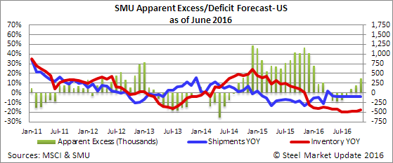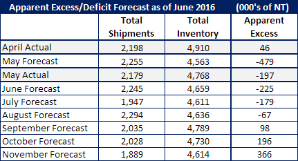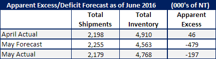 We did correctly forecast service center inventories would move into a Deficit which, based on our model, stands at -197,000 tons (we had forecast the deficit would be greater than the -197,000 tons).