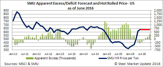 Flat rolled steel inventories being held by U.S. steel service centers have moved from an Apparent Excess to a Deficit based on our analysis of the recently released data by the Metal Service Center institute (MSCI). We have been reporting on the reduction of the Apparent Excessive inventories being held at flat rolled steel distributors for some time now. As inventories declined and moved into a Deficit based on our model, this has help move distributors from a hold mode in buying to a much more active mode. As lead times expanded the need to buy increased which resulted in the tight negotiating positions taken by the domestic steel mills.