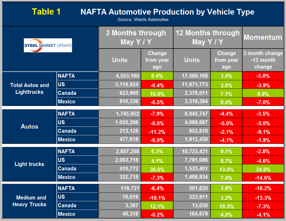 The percentage of autos in the production mix of all three countries has been declining, driven by consumer buying preferences which in turn are heavily influenced by gas prices. The change in preference for light trucks tends to favor the US and Canada over Mexico because the mix of light vehicles is so different by country. The percentage of autos in the Mexican mix in the last three months was 58.9 percent but only 33.8 in the US and 34.2 percent in Canada. This means that Mexico has staked out a higher relative capacity in autos which will serve it well when gas prices eventually rebound.
