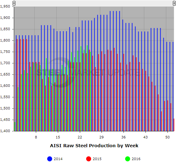 SMU Note: Below is a graphic showing the weekly raw steel production history. To use the graphs interactive capabilities, you must view it on our website. You can do this by clicking here. If you need help navigating the website or need to know your login information, contact us at info@SteelMarketUpdate.com or by calling 800-432-3475.