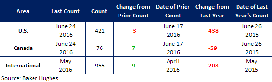 According to Baker Hughes data from June 24, 2016, the U.S rig count for the week was 421 rigs exploring for or developing oil or natural gas. This is down 3 rigs compared to last week, with oil rigs down 7 to 330 rigs, gas rigs up 4 to 90 rigs, and miscellaneous rigs unchanged at 1 rig. Compared to this time last year, the 421 count is down 438 rigs, with oil rigs down 298, gas rigs down 138, and miscellaneous rigs down 2.