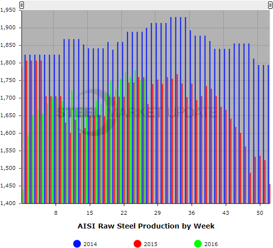 SMU Note: Below is a graphic showing the weekly raw steel production history. To use the graphs interactive capabilities, you must view it on our website. You can do this by clicking here. If you need help navigating the website or need to know your login information, contact us at info@SteelMarketUpdate.com or by calling 800-432-3475.