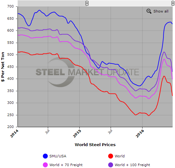 Below is a graph comparing world HR export prices against the SMU domestic HR average price. We also have included a comparison with freight and traders’ costs added which gives you a better indication of the true price spread. You will need to view the graph on our website to use it’s interactive features, you can do so by clicking here. If you need assistance with either logging in or navigating the website, please contact us at 800-432-3475 or info@SteelMarketUpdate.com.
