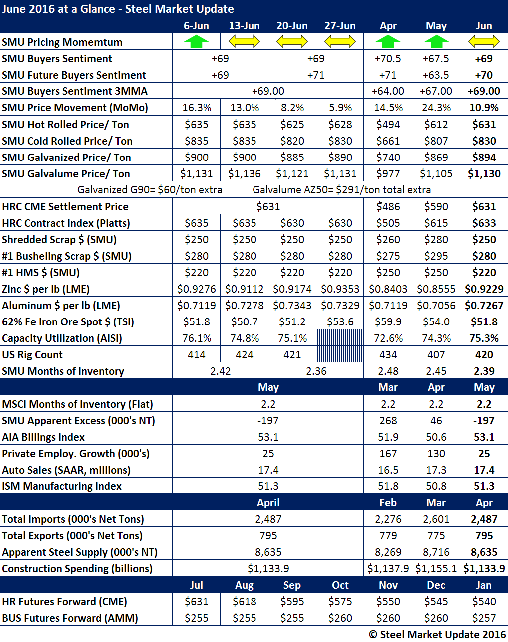 SMU Price Momentum Indicator was adjusted to “Neutral” during the month of June. We believe prices will trend sideways (or bounce up and down, which is what we have seen over the past couple of weeks) until momentum is re-established in one direction or the other. The price increase announcements made by ArcelorMittal and NLMK USA during the month do not appear to have had any effect on the direction of prices.