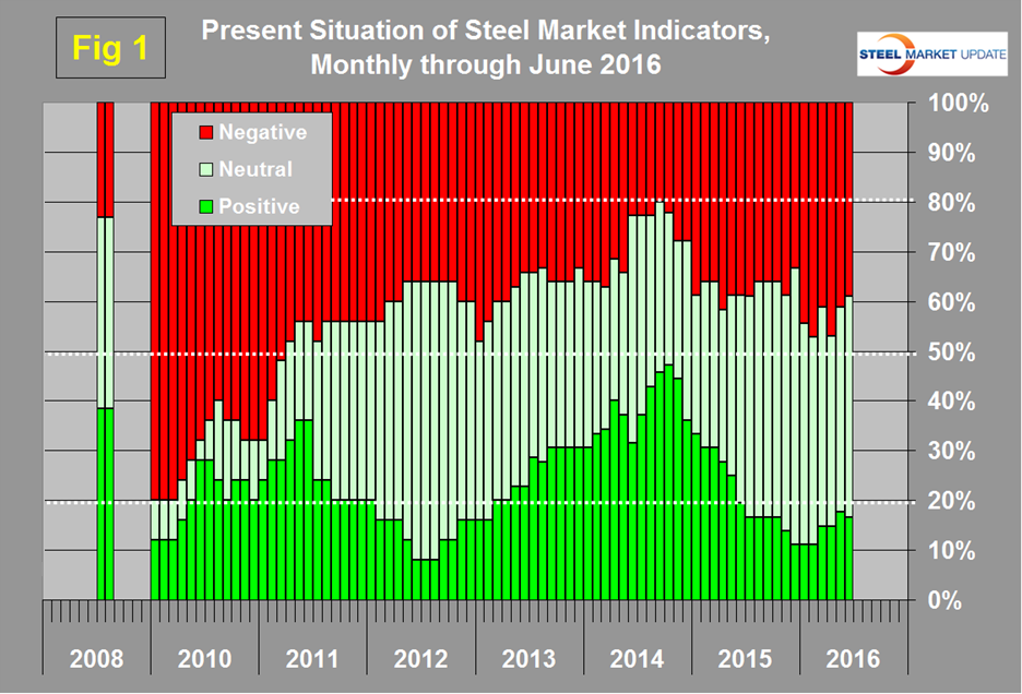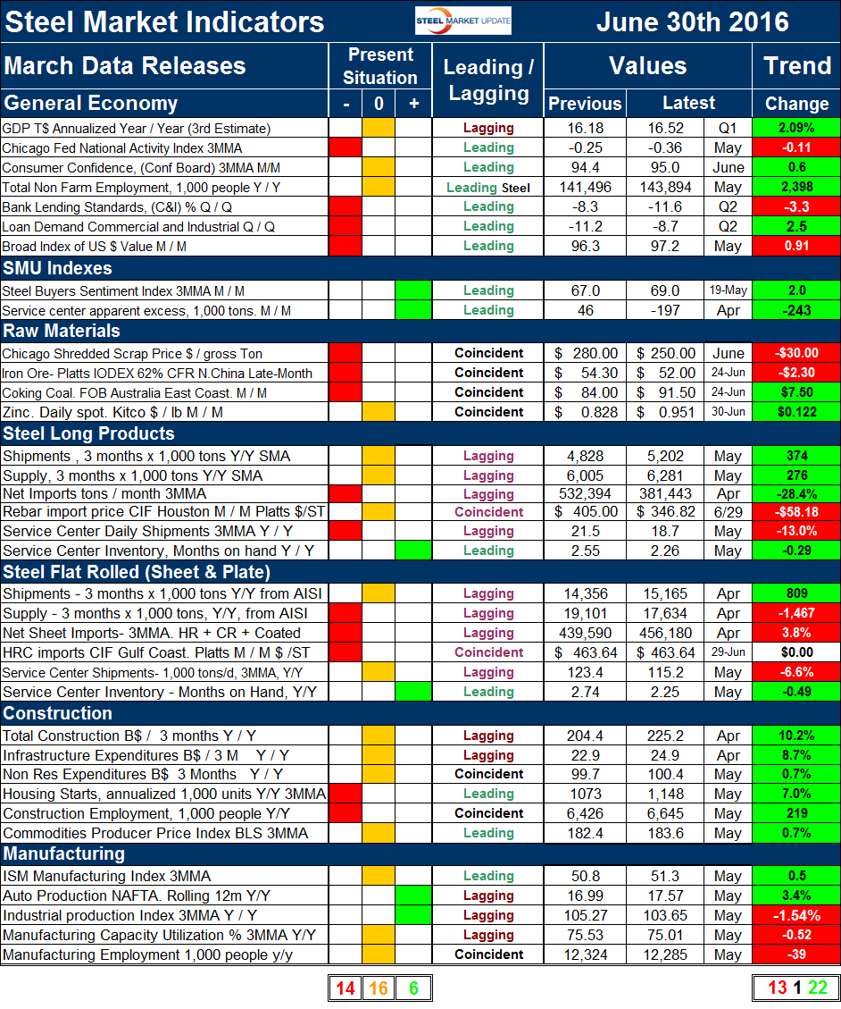 There was no change in the net number of positive, negative or neutral indicators since we last published on May 31st though there were several changes in the detail. Our intent in using the word neutral is to say that this indicator is considered to be in the mid-range of historical data. The Chicago Fed National Activity Index was downgraded from neutral to negative when the three month moving average (3MMA) of its value fell below negative 0.25. The price of zinc was upgraded from negative to neutral as it rose above 95 cents per pound. Shipments of flat rolled products were upgraded from negative to neutral when the volume exceeded 15 million tons in three months through April which was the latest month for which data is available. There were no changes to the present situation of either construction or manufacturing indicators. We currently regard 6 of the 36 indicators to be positive, 16 to be neutral and 14 to be negative on a historical basis. The present situation of the general economy is considered to be neutral to weak with no indicators classified as strong. This week in its third iteration, GDP in Q1 was revised up from the first and second estimates (note the growth of GDP in this report is Y/Y not Q/Q as is the normal and misleading way of reporting). The SMU proprietary indexes are both historically strong. All the raw materials prices with the exception of zinc currently have a negative present situation. Shipments and supply of long products through May based on SMA data look similar to flat rolled through April based on AISI data (AISI reports lag the SMA).