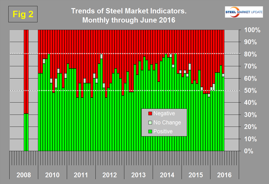 In October 2014 the proportion trending positive was 80.6 percent which coincided with the highest month of total steel supply since the recession. There was a steady deterioration through 2015. At the end of 2015 the proportion trending positive fell below 50 percent for the first time since March and April 2013. Figure 2 shows the pre-recession situation at the far left of the chart. In August 2008 over 2/3 (69.2 percent) of our indicators were trending negative and the steel market crashed in September of that year.