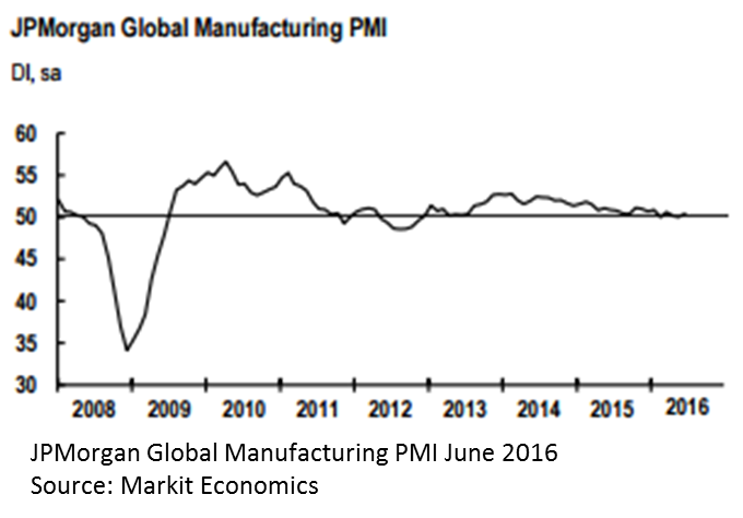Global manufacturing was subdued in June according to a reading of 50.4 on the JPMorgan Global Manufacturing PMI. The PMI gained just 0.4 points with most of the solid improvement in the European Union. It should be noted that the data for the report was collated before the vote by the UK to exit the EU. Global manufacturing output increased to 50.5 from the “no change” reading of 50.0 in April; new orders picked up 0.3 points. New exports orders continued to fall but at a slower rate in June. Pricing for both input and outputs rose but at a weaker pace.