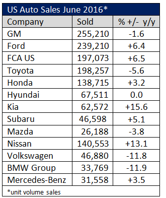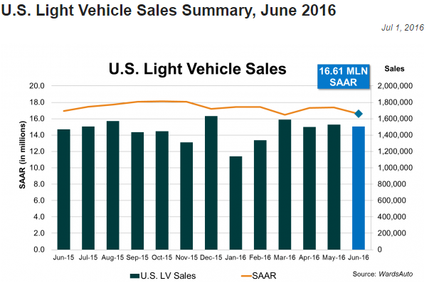 Despite a 2.5 percent year-over-year increase in June, U.S. automotive sales were slower than the 4.0 percent expected by most analysts. WardsAuto reports sales totaled 1.5 million units last month but the seasonally adjusted annual rate was 16.6 million units, well below the 17.0 million in June 2015 and at the slowest sales pace of the past year.