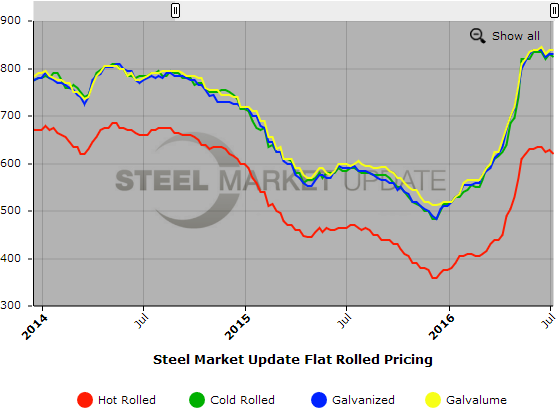 SMU Note: Below is a graphic showing our hot rolled, cold rolled, galvanized, and Galvalume price history. To use the graphs interactive capabilities, you must view it on our website here. If you need help navigating the website or need to know your login information, contact us at info@SteelMarketUpdate.com or by calling 800-432-3475.