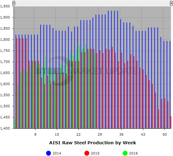SMU Note: Below is a graphic showing the weekly raw steel production history. To use the graphs interactive capabilities, you must view it on our website. You can do this by clicking here. If you need help navigating the website or need to know your login information, contact us at info@SteelMarketUpdate.com or by calling 800-432-3475.