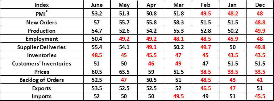 My favorite time to nap is about midway through the afternoon NFL games on Sunday. Now is a good time as well as the HRC futures markets slips into the summer doldrums. In fact, pricing really hasn’t moved in months. But as they say, the early bird catches the worm so don’t get caught napping for too long because “life moves pretty fast. If you don’t stop and look around once in a while, you could miss it.” So take a look at this, The ISM Manufacturing Purchasing Managers Index. It’s pretty important.