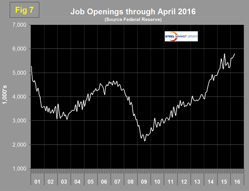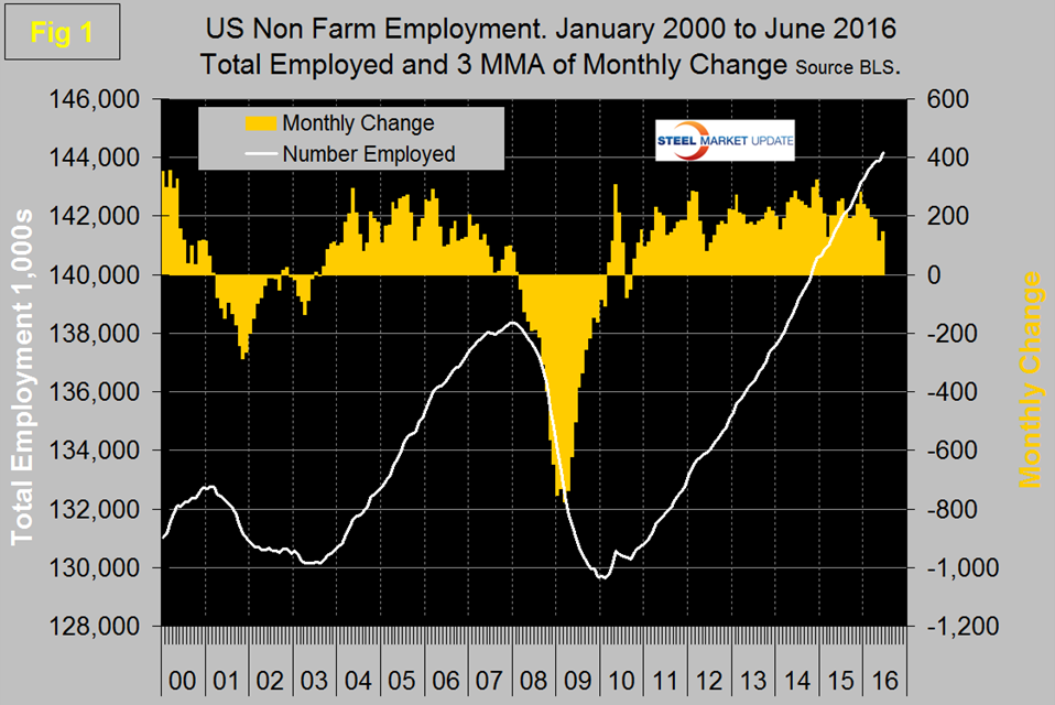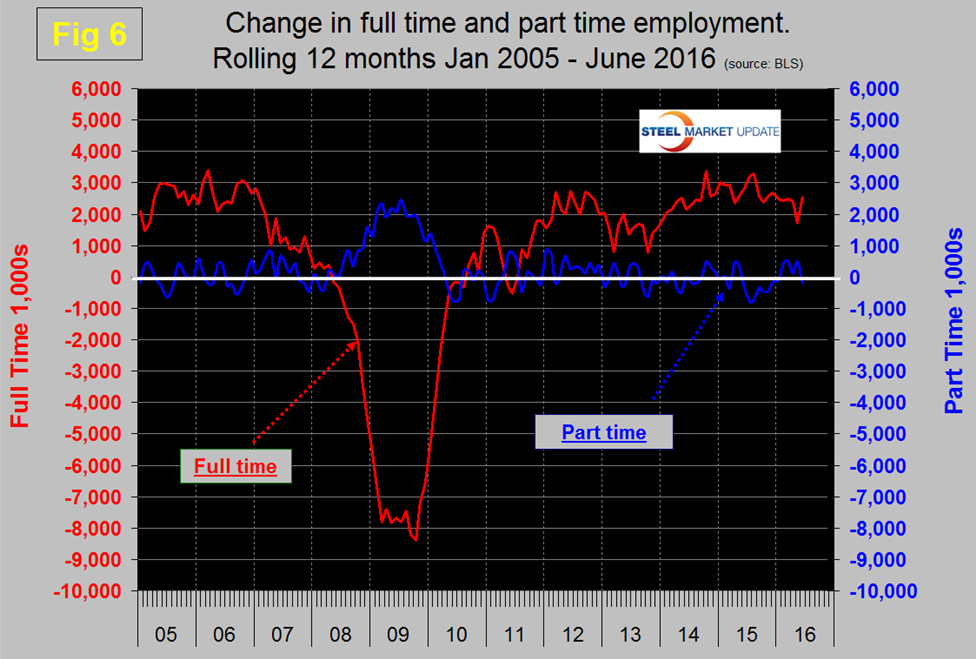 In June manufacturing gained 14,000 jobs but total manufacturing employment was 0.2 percent less than a year ago. In the first half of 2016, manufacturing has lost 24,000 jobs after gaining 8,000 in the second half of last year. Primary metals lost 12,000 in the 2nd half of 20015, lost 9,000 in the 1st half of this year and has had only one positive month out of the last eighteen. Table 1 shows that in June there were no positive results in the five manufacturing sectors that we examine. Note the subcomponents of both manufacturing and construction shown in Table 1 don’t add up to the total because we have only included those that have most relevance to the steel industry.