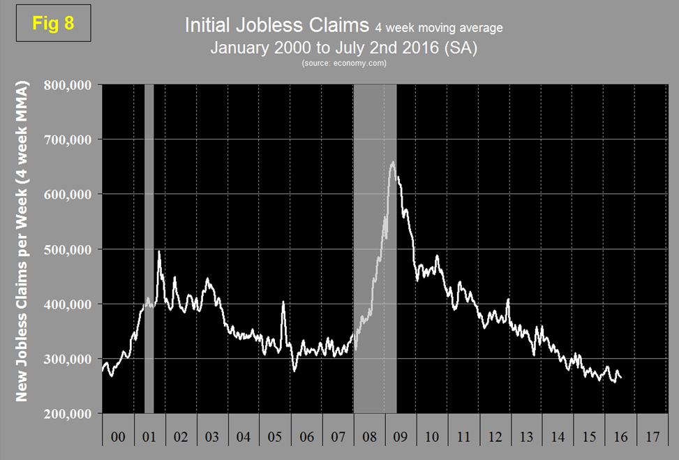 Initial claims for unemployment insurance have been relatively consistent for the last year. The four week moving average of new claims at the beginning of July was down by 5,000 from the beginning of June and was lower than at any time in the last 43 years (1973) (Figure 8).