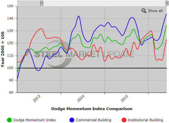 Below is a graph showing the history of the Dodge Momentum Index. You will need to view the graph on our website to use it’s interactive features, you can do so by clicking here. If you need assistance with either logging in or navigating the website, please contact our office at 800-432-3475 or info@SteelMarketUpdate.com.
