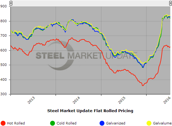 SMU Note: Below is a graphic showing our hot rolled, cold rolled, galvanized, and Galvalume price history. To use the graphs interactive capabilities, you must view it on our website here. If you need help navigating the website or need to know your login information, contact us at info@SteelMarketUpdate.com or by calling 800-432-3475.
