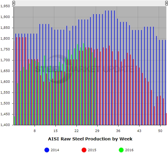 SMU Note: Below is a graphic showing the weekly raw steel production history. To use the graphs interactive capabilities, you must view it on our website. You can do this by clicking here. If you need help navigating the website or need to know your login information, contact us at info@SteelMarketUpdate.com or by calling 800-432-3475.