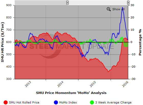 The change in MoMo can be a useful indicator in depicting the severity of price movements and evaluating the directional trend for flat rolled steel prices. The week-over-week change in MoMo was -1.61 percent, following a change of -3.15 percent last week. This indicates that the rate of the increase has slowed.