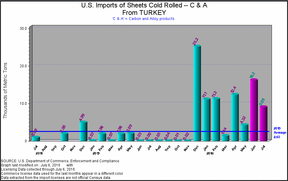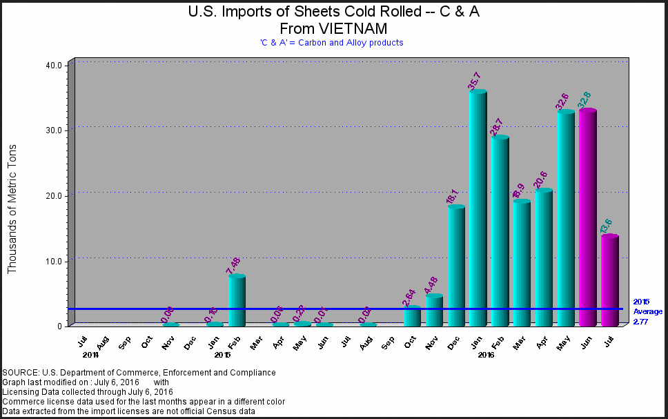 As you can see by the graph below provided by the U.S. Department of Commerce, Vietnam was a non-factor in the United States cold rolled market. In May and June Vietnam shipped 36,000 net tons (graph below is in metric tons) and was the single largest exporter of cold rolled to the U.S. during this time period. The graph below has data through the 6th of July. As of July 12th Vietnam was on pace to ship more cold rolled to the United States in July than it did in May and June (based on license data).