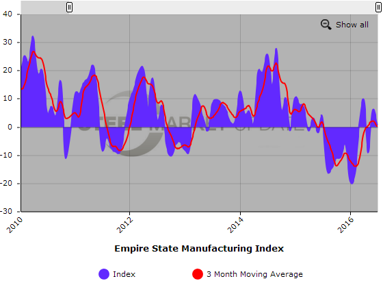 Below is a graph showing the history of the Empire State Manufacturing Index. You will need to view the graph on our website to use it’s interactive features, you can do so by clicking here. If you need assistance with either logging in or navigating the website, please contact our office at 800-432-3475 or info@SteelMarketUpdate.com.