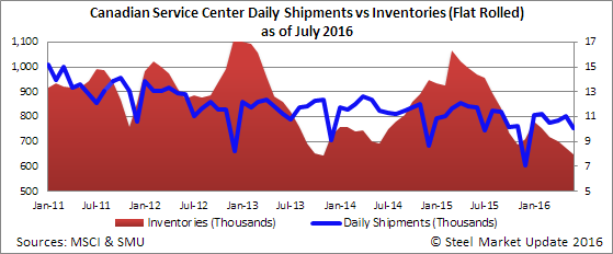 Canadian shipments for all steel products in the month of June were 374,100 net tons, a decrease of 3.7 percent from the month before and a decrease of 14.4 percent from June 2015. Inventories at the end of the month stood at 1,120,500 tons, down 2.6 percent from last month and down 26.0 percent from the same month one year ago.