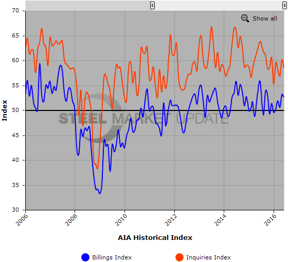 Below is a graph showing the history of the Architecture Billings Index and Inquiries Index. You will need to view the graph on our website to use it’s interactive features, you can do so by clicking here. If you need assistance with either logging in or navigating the website, please contact our office at 800-432-3475 or info@SteelMarketUpdate.com.