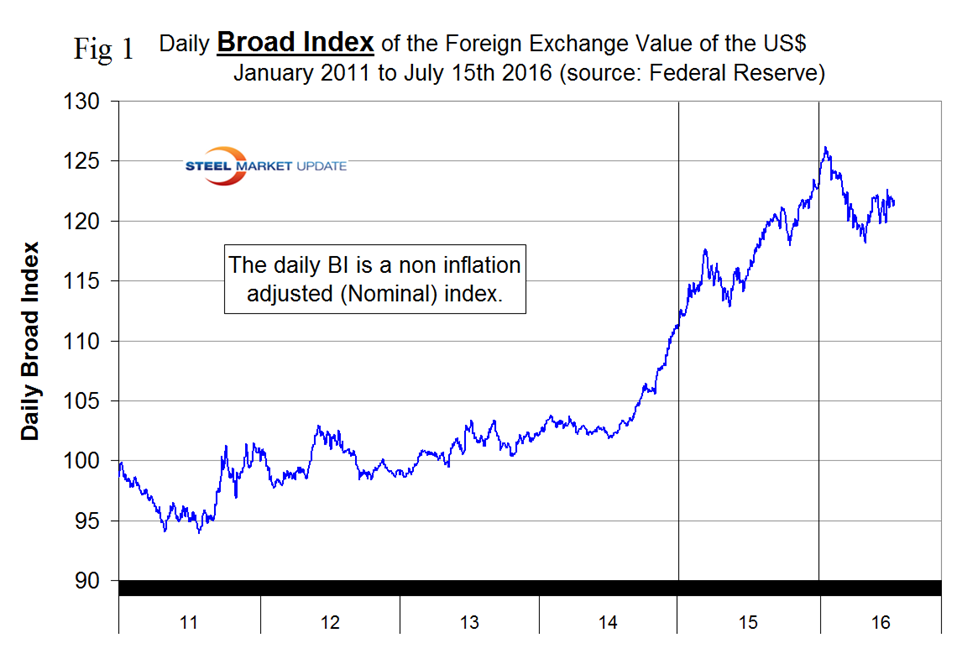 The Broad Index value of the US $ is reported several days in arrears, the latest value we have was dated July 15th (Figure 1).