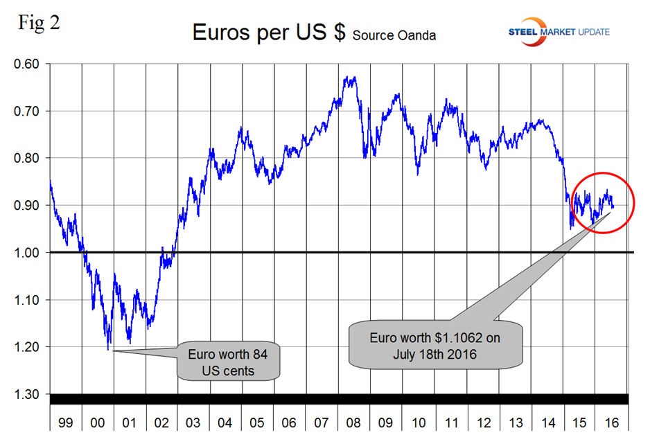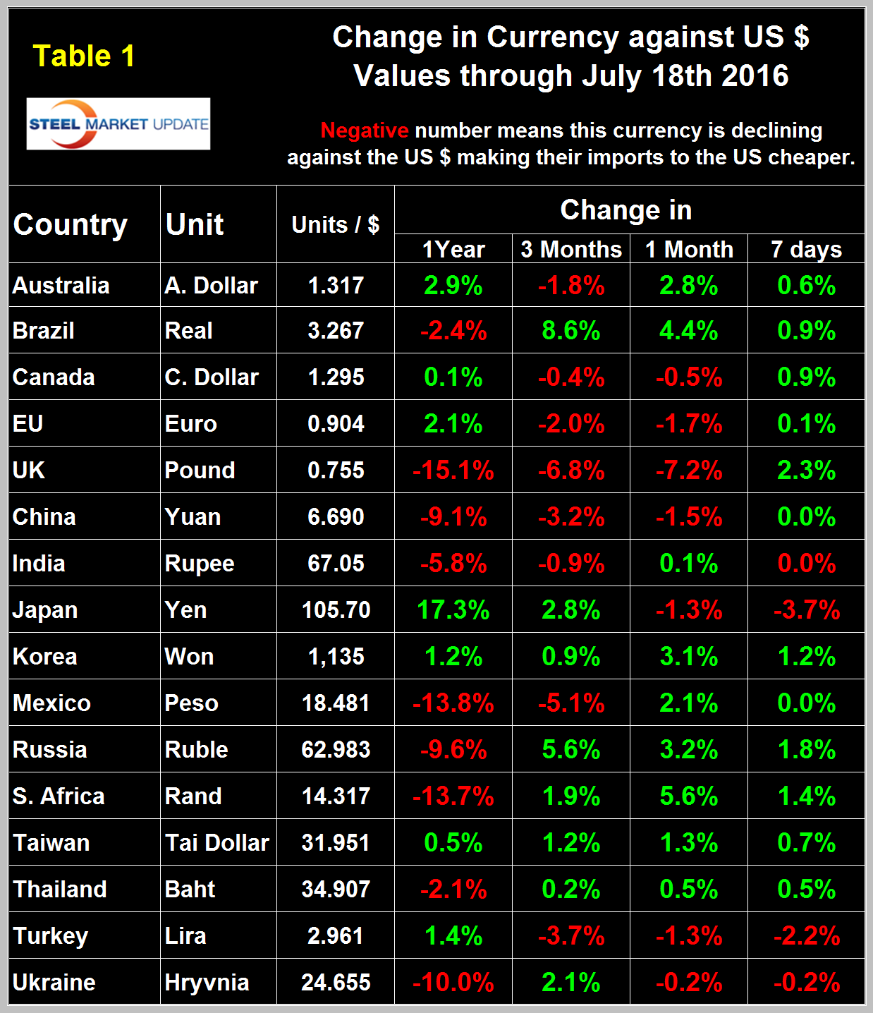 In each of these reports we comment on a few of the 16 steel trading currencies listed in Table 1 and include extracts from sources that we have come across that we deem credible. Not surprisingly there has been a dearth of currency reports in the financial press since our last update so external comments are scarce in this update. Charts for each of the 16 currencies listed in Table 1 are available through July 18th for any reader who requests them.