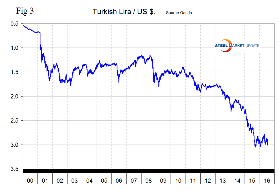 The Lira took a hit of 4.2 percent on the 16th following the failed coup on the 15th and is down by 1.3 percent in the last month (Figure 3). It currently takes 2.96 Lira to exchange for a US dollar. The all-time low was 3.0522 on September 15th last year.